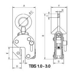 Подъёмная петля на карданном шарнире позволяет применение таких захватов в двухветвевых системах (ветви под углом друг к другу). Петля имеет опорный эксцентрик, который при сторонней тяге упирается в боковину захвата и рычажным моментом усиливает зажимное действие.